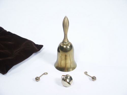 The magician removes a brass bell 2 3/4” high from his pocket where it is heard to jingle as he does so. What follows is a routine where the clapper of the bell migrates from his pocket to underneath the bell in a very magical way several times before the appearance of a small round bell followed by the ultimate climax of a spectator picking up the brass bell to find it is a solid bell! Includes 2 pages of instructions with routine and cloth carry bag. Condition very fine.