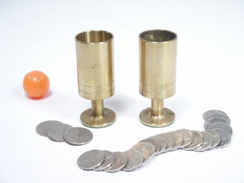 Two brass vases are shown along with 3 quarters. In a mysterious fashion the quarters one at a time leave one vase and travel to the other. A finale to the fun effect is the appearance of a load of loose nickels! Includes 2 pages of instructions with Al Cohen handling and routining. Condition vases with some tarnish, otherwise very fine and includes quarters and nickels along with drawstring carry bag.