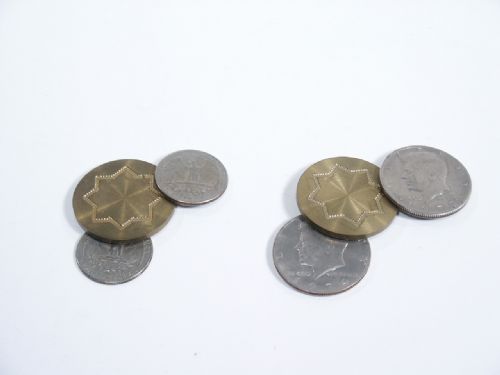 This set made with half dollar coins and quarter coins. Of the 6 effects described you will be able to have transpositions that seem impossible and one is a penetration through the bottom of a glass as well. One effect makes use of a steel playing card which is not supplied. Condition very fine.