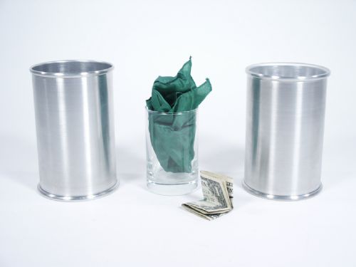 This is an incomprehensible effect where a spectator’s bill which is signed or marked is placed inside a 9” silk and held in place with a rubber band, the silk holding the bill is then placed inside a glass and covered with an aluminum tube. In another aluminum tube a second glass is placed upside down with both tubes being a good distance apart. The first tube is lifted away and the glass is empty! The second tube is lifted away and the empty glass placed there before is now covered with the silk which is held on by a rubber band with the bill inside the glass! This is handed to a spectator with the request the band and silk to be removed and it is discovered that it is the same signed bill! This is from the late 1980’s and from my own personal experience of demonstrating this effect it always proved to be a winner. Includes tubes, glass and silk along with instructions. Tubes stand a little over 5” in height and have a rolled edge at both ends. Bill pictured not supplied. Condition fine.