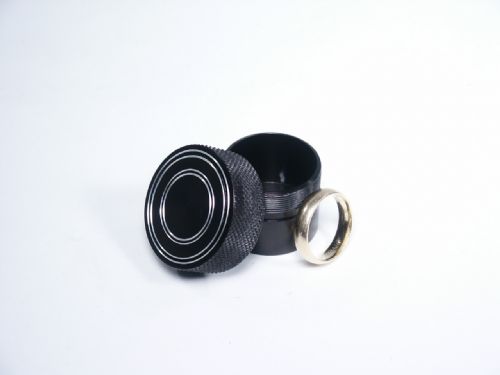 This handsome metal casket will allow for quick insertion of a finger ring or similar size object or coin prior to bringing into view of a spectator. When spectator is asked to open the casket by unscrewing the lid, it will take many, many turns before it comes open which further adds to the mystery. This is a great utility item to incorporate in your close up routine. This includes instructions from a similar product to understand mechanics of casket. Ring pictured not supplied. Condition very fine.