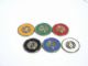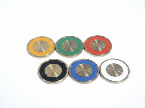 Performer shows 6 different color chips made of brass and places them into one row. He also takes out a business card and states that on it is recorded with invisible markings, a prediction. Now he has one of the spectators select a number of the possible 1, 2, 3, 4, 5, 6. He states that he will only use numbers not spelling and that one and six can be selected. Once the spectator gives the number, the performer moves forward the corresponding chip and states the color. Now he takes the business card and some ashes from an ashtray and rubs the ashes on the business card. The prediction now reveals itself and names the color of the chosen chip. Includes instructions. Condition minor paint absence, otherwise fine.