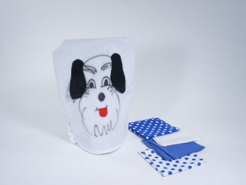 A bag is shown to be empty on the inside. A solid blue and white silk are put into the bag. When the silks are taken out of the bag, the blue silk has white spots on it and the white silk has blue spots on it. When the bag is now shown on the inside, there is a dog named Spot. Bag measures 12 1/2” x 10”. Includes instructions. Condition as new.