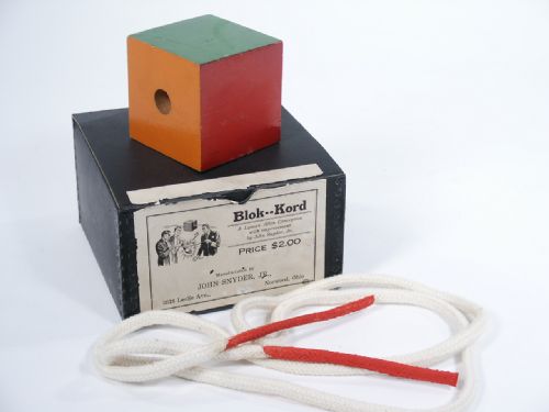 The earliest block release from rope using a multi-color solid hardwood block 2 1/2" in size along with the rope with red tipped ends. This is still the best block from rope release and one that can be fully examined by a spectator. From 1945 and includes 2 pages of instructions with illustrations by Hahne. In the original box. Condition First Rate.