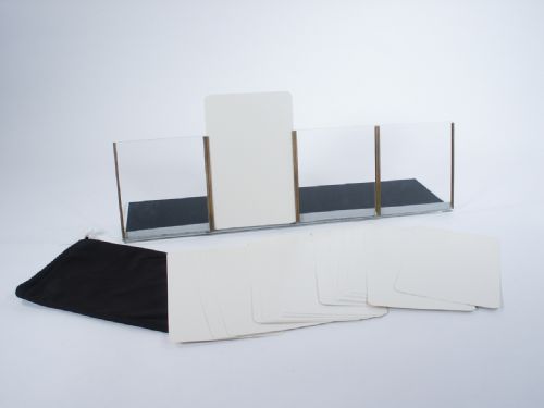 Using a crystal clear stand in Plexiglas which takes four jumbo cards the magician asks the audience how many are present with a first name with four letters? The magician points to one of the respondents and asks their name. We will suppose the name is Alan. A jumbo deck of letter cards is shown and shuffled and four spectators each choose one card. There is no force used and they are given back to the magician and the person whose name is used is asked in which order the magician should place the cards on the stand. Each card is fixed in brass profiles so it is impossible to change the order afterwards. When all of the cards have been placed on the stand it is lifted up and turned around so the audience may see the face of the cards. The cards form the name Alan! The cards may be handed for examination if desired. Includes instructions. Condition as new.