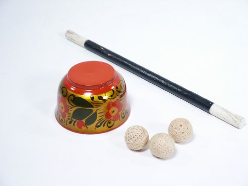 A beautiful Russian lacquer bowl in wood measuring 1 3/4” high with a mouth diameter of 2 7/8” diameter along with 3 early crochet knit balls and a wood wand 9 7/8” in length. Condition wear to wand, soil to balls, Russian lacquer in beautiful condition. All in as found with no instructions.