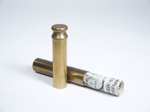 With this device in brass, you may tear a bill to shreds and have it restore into a complete bill once more. No instructions. Easy to do. Bill pictured no supplied. Condition very fine.