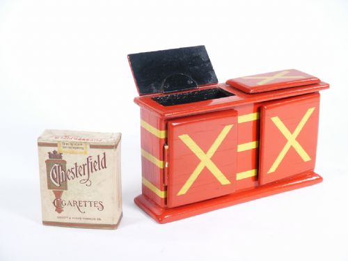 Same effect as Sucker Die Box only with a pack of Chesterfield Cigarettes. When you place the shell in the box it will actually slide giving the sound you need. Made of wood and lacquer finished. No instructions. Condition due to age the paint is graining some, otherwise very fine.