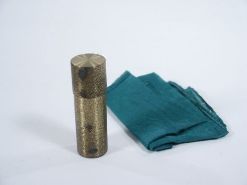 This 2 3/8" tube with cap is shown and a silk is placed inside with cap put in place. At the will of the magician he is able to extract the silk through the wall of the tube and all is then examined! German language instructions but not difficult to figure out. Condition tube with heavy tarnish but works fine.