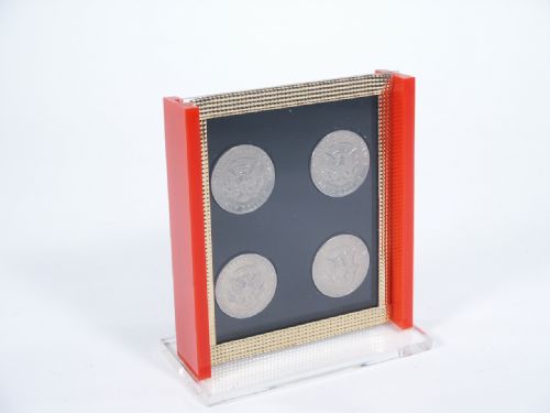 This beautiful stand made of plex is shown and covered with a silk (not supplied). Coins are shown and vanished. The silk is removed and there in the frame are seen the four coins! This may be used for a card as well. Coins pictured not supplied. This stands 5" high and 4 1/2" wide. Includes instructions. Condition First Rate.