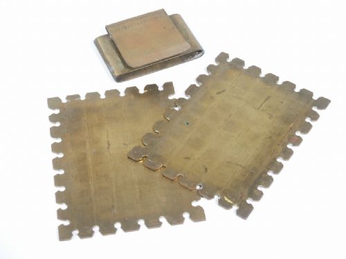 Imagine having a card selected and signed and it vanishes from the deck. Suddenly these brass plates that are bound together with rubberbands in every direction are laid on the table and spectator is asked to check inside. You guessed it, their card is inside! With this high quality set you will be able to do this. No instructions. Condition small area of patina on one side of plate and tarnish, otherwise very fine.