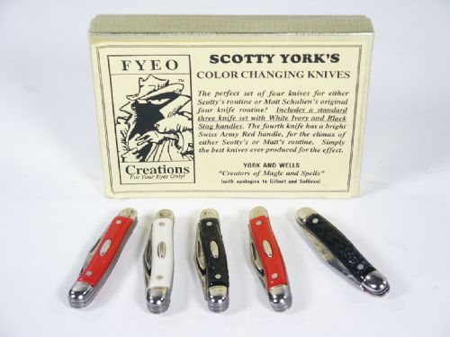 Five knives in all in the following arrangement: red/white, white/white, red/red, stag black/white, stag black/red. This set does not have a holder but does include the 34 pages of routining which includes the original handling and presentation of the color changing knives and Fred Kaps Final Color Changing Knife routine from Scotty's Private Notebooks never before published. Condition First Rate.