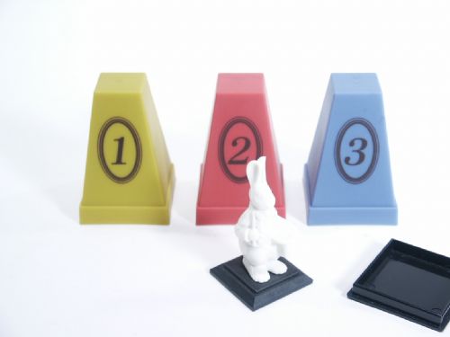 Find the hidden rabbit every time! Allow your spectator to examine all three cups and the rabbit figurine. When your back is turned, your spectator hides the rabbit under any cup and mixes up their order. You are always able to know the location of the hidden rabbit. Includes instructions. Condition very fine.