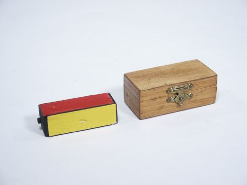This wood chest measures 3" wide x 1 3/8" deep x 1 1/8" high and contains a block which is finished in a different color on the four sides. A spectator is asked to place the block within and close the lid snapping the hasp shut. At this point you will be able to tell the spectator the color orientation of the block! Includes instructions. Condition light soil to chest with light wear to block, otherwise very good.