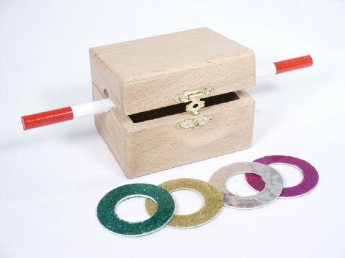 Measures 3 5/16" wide x 2 5/8" deep x 2 1/4" high with hasp closure, chest is made of wood, wand is 7 3/4" in length. Bring out the rings in an uneven spread in your right hand and have a spectator choose any color he sees (let's say the red one). You then have the ring examined by a person; the box and the wand by another. The rings are dropped into the box and the box is shown around one more time. The wand is placed through openings in the sides of the chest and a spectator is asked to hold onto the ends of the wand. The lid is then slightly opened and the chest pulled downward, the chosen ring is on the wand! Includes illustrated instructions. Condition very fine.