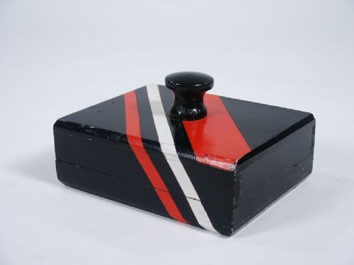 Made of wood and measuring 3 3/8" x 4 1/4" x 1 1/2" high not including knob. This case has the ability to drop two flaps from the lid, one at a time by twisting the knob on top a quarter turn. No instructions. Condition very good.