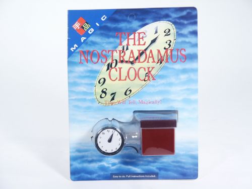 The magician exhibits a small clock in a box. Any spectator is asked to think of any time of day but not tell anyone. The magician sets the clock at an hour, places the clock in the box and closes the lid. Only now is the spectator asked to name the time he is thinking of. When the cover is removed from the box the audience sees that the magician has exactly predicted the hour. The Nostradamus Clock permits you to perform an extraordinary demonstration of magical premonition. In the past, the magical equipment to perform such a trick cost hundreds of dollars. The Nostradamus Clock uses a fiendishly clever new principle that will fool everyone. In original packaging and includes illustrated instructions. Condition packaging opened, otherwise very fine.