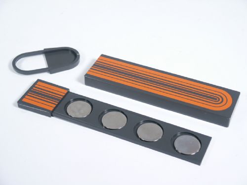 Quicksilver is the ultimate coin drawer. This close-up illusion requires no sleight of hand yet seems totally impossible. The magician places four steel slugs into recesses in a thin drawer. The drawer is inserted in the Quicksilver case and magically, one of the slugs is minted into a real quarter! One by one, the slugs are stamped into real money. The last slug is changed into a penny by mistake!… but a magic wave, some hocus pocus, and at the end four quarters emerge. (Real coins not supplied) Includes illustrated instructions. Condition very fine.