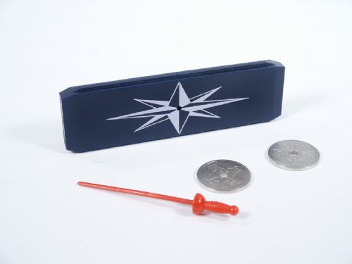 A coin is magically pierced thru the heart! The magician displays three objects: an oriental coin with a hole in the center (the vampire), an empty slide (the coffin) and a small sword (the stake). The stake is placed through the center of the slide and the coin is dropped into the top. Magically, the coin slides all the way through, penetrating the stake, and emerging at the bottom. When this is repeated the coin seems to get stuck in the middle. The slide is pulled apart and it is seen that the stake has impaled the coin! The first effect, the penetration is puzzling. But then the coin is seen caught in the stake, it is a real miracle. Coin Of Dracula requires no sleight of hand and comes supplied with everything required. The ingenious props make everything easy. Includes illustrated instructions. Condition very fine.
