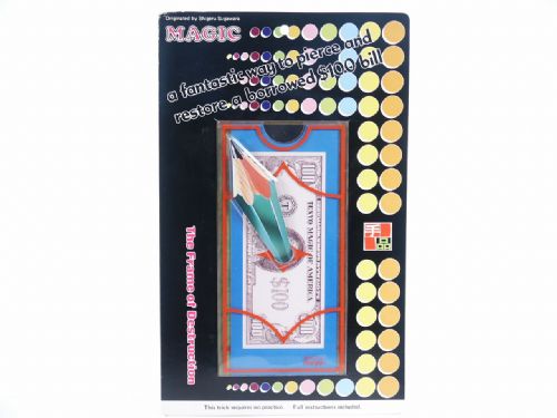 A fantastic way to pierce and restore a borrowed $100 bill. The magician borrows a $100 bill (the trick will work with a one dollar bill as well). It is placed in a clear plastic frame which has a hole drilled through its center. The frame is placed in an envelope and a pencil is thrust through the center of the frame. When the frame is removed, the bill is unharmed! Everything can be examined. No sleight of hand required. Includes illustrated instructions and in original packaging that has been opened. Condition very fine, never used.
