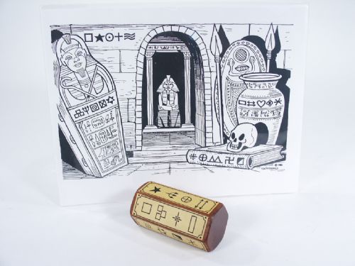 The log is removed from it’s carrying bag (not supplied) and passed for examination while you relate the story of how it was used by the “Prophets” in ancient Egypt to determine a person’s future. The log is rolled out several times showing that it comes up with a different set of Hieroglyphics each time. When person decides he is happy with a particular side he is asked to select one of the symbols and to fix it firmly in his mind. The log is then put away. The large picture of the tomb is then shown and person is to note where his symbol appears. It may appear on the wall, the book, the urn, etc. You explain that symbols in the picture have special horoscopic meanings and by determine the type of person he is you can reveal his selection. Spectator tells you where his symbol appears and you mysteriously reveal the name of his chosen design. You never look at the picture as he makes his determination. Includes illustrated instructions. Condition very fine.