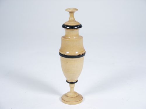 A beautifully finished vase is shown to the spectators and its mechanism thoroughly explained. A coin is placed in the vase, the movable button at the top pressed down, and when the vase is opened the coin has vanished. Now the bottom of the vase is pressed upwards and the coin immediately reappears. Vase and coin are now given to the spectators, who, however, fail to cause the coin to vanish, although repeating exactly all moves. A very clever piece of mechanism impossible to detect. Stands 5 1/4" high, beautifully turned of wood trimmed in black lacquer. Coin not supplied and made for a coin of 24 mm in size. Condition very fine.