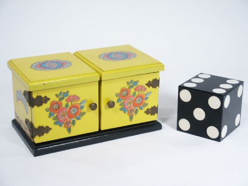 Made with a 3" die with double door feature and of wood with piano hinge for top doors and ornate brass hinges for the fronts. This is a painted box from the early years. Includes instructions. Condition minor absence of border transfers, otherwise very good.