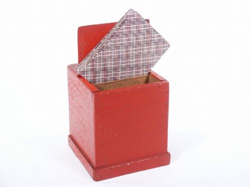 Made of wood, standing 4" high and makes use of wind up mechanism to effect the rising of cards. Some cards found within were of Steamboat variety. No instructions. Condition fine.