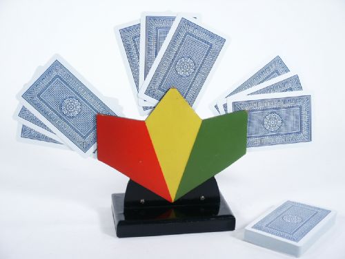 From a shuffled pack three packets of three cards each are clipped in position on a neat fan-shaped stand. With a perfectly free choice spectators nominate two packets to be discarded. The remaining cards are then distributed as the packets were, and two of these discarded. The remaining card is inevitably the one the performer wants it to be, the previously selected card! Compact apparatus, which does the work for you. Includes cards for three different outcomes. Included instructions. Condition fine.