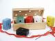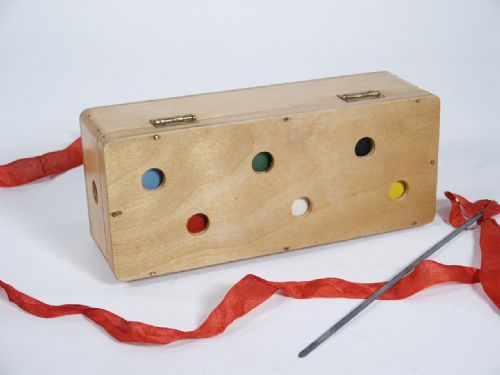 This is the original from Great Britain and uses a large needle with ribbon to thread the blocks. Solid wood cabinet measures 7 1/2" wide x 3 1/8" deep x 2 1/4" high having six openings with which spectators may see 6 differently colored solid wood blocks. All blocks have one hole through the center allowing for the passage of a ribbon which secures them all within the box. A spectator or two make selections of a total of two colors and the blocks are placed within the cabinet with the hasp closed and the ribbon threaded through. With the ends of the ribbon in full view the magician opens the lid toward himself and asks for the colors to be named once more and suddenly they fall from within onto the table! The open box is turned toward the spectators showing the four remaining blocks still firmly held in place by the ribbon! Everything may be examined! Suitable for Close-up, Cabaret (surrounded) or Stage performance. A nicely made unit out of solid wood. Includes instructions. Condition very fine.