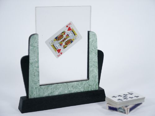 After two panes of plex are bound with rubberbands and placed in a stand a card is selected and returned to the deck (included). The magician commands the selected card to appear between the two pieces of plex and it does so visibly! This may be done visibly or under cover of a cloth, whatever your personal preference. No instructions but you should be able to understand the workings with apparatus in hand. The deck is early and in Bridge size having the tax stamp still affixed to the box from the US. Condition fine.