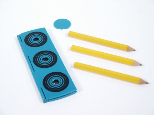 Push Pencils Through Borrowed Coins. Three coins are placed into a plastic case. A small sheet of paper is placed over the coins and the lid is closed. Three pencils are thrust through the case and penetrate the solid coins! When the paper is pulled out, the coins can be still be seen, right where the pencils were pushed through the case. Spectators can examine the case, coins, pencil and paper! Includes illustrated instructions. Condition very fine.