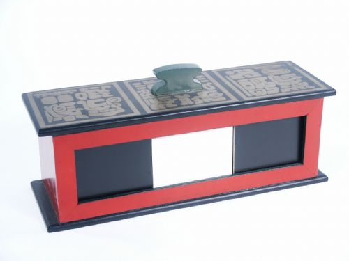 Found new still wrapped in tissue, measures 10 1/4" long x 3 3/8" deep x 4 1/2" high to top of handle with blocks measuring 2 7/8". The classic effect of 3 blocks placed in a frame and 2 end blocks being pushed together squeezing away the center block which appears later in a hat, or bag, or what have you. Includes illustrated instructions. Condition as stated, unused.