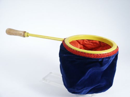 From Great Britain. Rim and handle is of metal with handle being of oak wood. Bag opening is 6" and this in very fine condition.