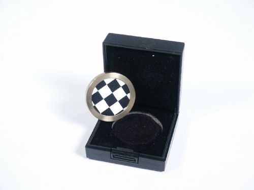 Magician shows a brass chip that is black and once placed in hand it is now shown to be white. This action is repeated and it changes back to black. The audience is catching on that the magician may be using a chip that is black on one side and white on the other. Placing the chip in hand once more the magician then opens his hand and drops the chip out and it is seen to be checker board design on both sides! It may be examined by a spectator! Condition very fine and includes carry case.
