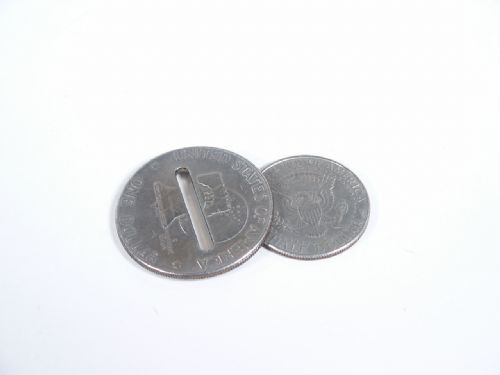 A Silver Dollar is shown to have a slot opening that is not quite large enough for a half dollar coin to pass through yet the magician is able to cause this to happen in a very magical way. Includes instructions. Condition very fine.