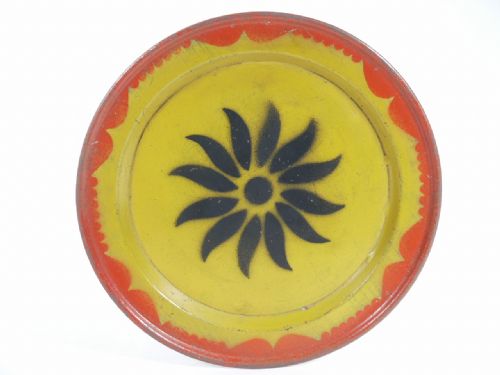 This early plate made of metal has a diameter of 9" and will hold up to 5 coins in a secret channel underneath and coins may measure up to 25 mm in size (approximate quarter size). Condition light surface pitting underneath tray not affecting performance, otherwise fine.