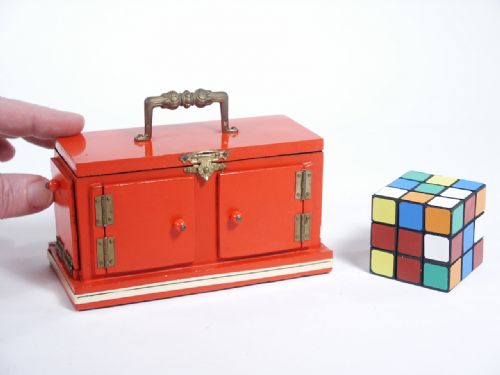 Making use of a block designed as a Rubiks Cube that measures 1 3/4" in size. The cabinet is of wood measuring 5 1/2" wide x 2 7/8" high x 2 5/8" deep having 6 doors which open on all sides and a large door atop that has a hasp closure. All doors at sides have magnetic closures keeping the doors closed. This petite cabinet also has a sounding mechanism for the sucker sliding feature. The operation of the vanish is much like the Mikame Block Vanish known to some. Condition very fine and uncommon.