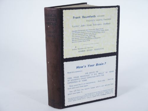 | Will Goldston Publication, London. Circa 1930's, cloth bound, 251 pages with 112 illustrations plus ads for the Goldston Locked Books. Unnumbered pages Ads in back of book for Goldston's Further Exclusive Magical Secrets. Contents: *The Feast of Lanterns *Introduction *The Disappearing Cloak *A Disappearing Walking Stick *Fire and Water *Catching a Card on a Knife Point *A Treacle Trick *Card Cricket *Magic Photography *A Transforming Card Table *Dyeing Silks *Bunglo *Dyeing Silks Ne Plus Ultra *The great Lemon *A Ring and an Orange *A ring and a Dove *With a Watch *The Nest of Boxes *A New Method in the Smoke Trick *The Incorrigible Cigars *A Super Rice Bowls Trick *How I saw the Great Indian Rope Trick *The Truth? About The Indian Rope Trick *Transit of Wine *The Recipe for Diamonds *Off with His Head *An Extemporized Drum Production *Another Drum Load *Optical Delusion *The Power of Suggestion *A Message from Mars *Marvelous Addition *A Magic Spell *Reading By Touch *Patriotic Drill *Flying Colours *On The Line *Transposing Milk and Sugar *The Topsy Turvy Tea Table *Under The Pillar Box *Tricky Tennis *Aerial Angling *Hoffmann's Bullet Trick *The Feast of Lanterns *The Junior Feast of Lanterns *The Housing Problem *The Rajah's Pearls *Aqua Vitae *Squeezed to a Jelly *What happened to Smith Minor. Condition previous owner Frank Baumforth in England attached heavy paper stock overlays to cover one of which is the Count the F's in a sentence How's Your Brain? and the other with a listing of his memberships. Inside front end paper is a photo of him in action with apparatus and front flyleaf with his bold signature and stamp. His stamp appears also at top of contents page, otherwise very fine and a book to have.