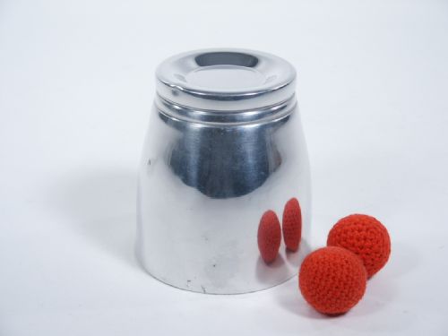 Cup stands 3 5/8" high with a mouth diameter of 3 3/8" and includes a chop set of crochet balls and drawstring carry bag. Condition light blemishes and one tiny ding at base rim, otherwise very fine.