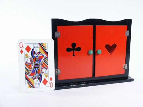 European. This is made of wood and measures 13 1/4" wide X 9 3/4" high and nicely decorated on the four doors with the different card pips. A card placed within (Queen of Diamonds) and doors closed. Frame is tilted in opposite direction of the placement and door open to show it has vanished but audience could detect some sound out of the ordinary. What follows is a back and forth showing of one door at a time finally all four doors are open showing the complete vanish of the card! Condition fine.
