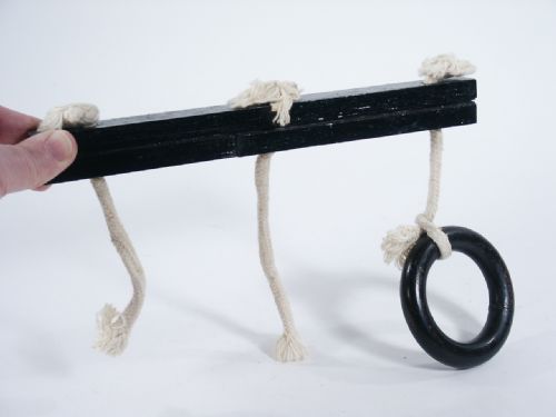 European version of Monkey Bar where ring tied to rope jumps from one end of the rod to other with climax being ring hanging from rope in center. Includes instructions. Made of wood and rod measures 10" in length. Condition fine.