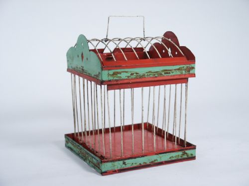 Cage stands 5 1/2" high plus handle x 4 5/8" x 4 5/8". This cage will open on top to allow for a small bird to be placed within prior to collapsing for placement in production apparatus of your choosing. Made of metal. Condition glue residue around borders, otherwise very good.