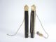 Pillars are made of wood and are 8 7/8" in length and together have a cord running through the openings near the end of the pillars. A knife (not included) may be used to slice through between the pillars cutting the cord yet when placed back together the cord is drawn back and forth. I have never seen such a hidden and hinged opening trap in any like this before. An early set. Condition good.