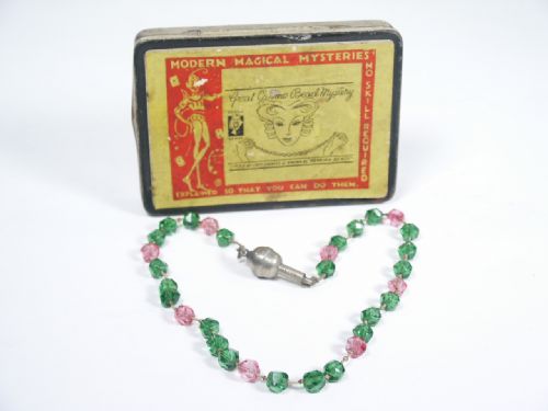 From Davenport's in Great Britain. Beads are removed from a lady assistant (if you have one) and they are cut on one end and allowed to fall into a glass (not supplied) leaving the catch and string still visible in the magician's hand. The loose beads are placed in the magician's mouth followed by catch and thread. Striking a profile the magician reaches into his mouth just past the lips and withdraws the now strung beads intact! The catch is hallmarked with the Demon stamp. Metal case is original. Includes instructions. Condition fine.