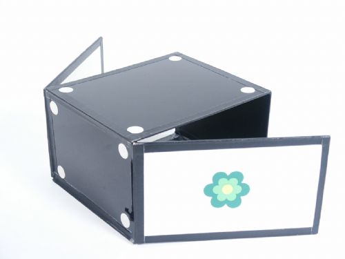 This box measures 6" x 4 1/4" x 6 3/4" having two door panels and made of plastic. Inside you will find one narrow panel that is tension held with elastic that allows for insertion of silks (not included). Condition good.