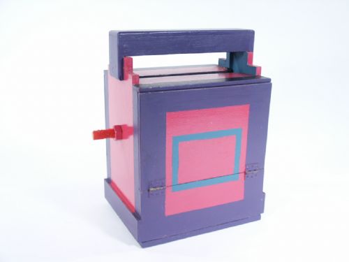 European. Made of wood and measures 8 3/4" wide x 6 5/8" deep x 12" high. Will vanish small birds or anything placed around horizontal position pole. Method is of Fantastic Frame Apparatus. Condition good.