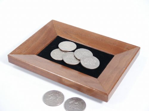 This beautiful solid walnut tray measures 6 7/8" x 5 1/8" and enables for the magician to secretly add up to 4 half dollar size coins in a routine of multiplying money or coins passing. Hallmarked on bottom with black velvet inlay on tray. Coins pictured not supplied. Condition very fine.