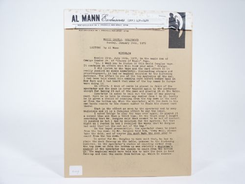 AL Mann Exclusives Lecture by Al Mann, Magic Castle, Hollywood. 1979, wraps, 11 pages. Effects: *Mindblow *The Shattered Link *Book-Tear *The-Chain-Of-Thought *The-Chain-Of-Thought-Reading *The Gold-Bug Predictions. Condition private collection identifier label, foxing to cover, otherwise very fine.