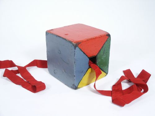 Block measures 5" in size and has mechanical arrangement for block to open so it may be made free of the ribbon. This is a piece circa 1930. No instructions but examination by a magical mind will give way to the secret. Condition well used.